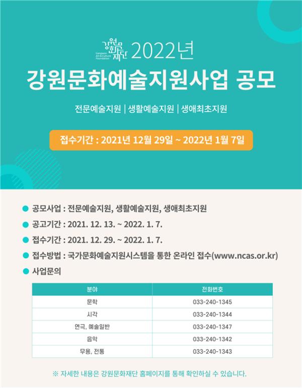 (재)강원문화재단에서는 도내 예술인 및 예술단체의 지속적인 예술창작활동 지원을 위하여‘2022년도 강원문화예술지원사업’ 공모를 실시한다.