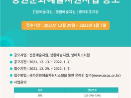 사업별 자세한 공모사항 안내를 위해 12월 16일 오후 2시 유튜브 채널(강원문화TV)에서 온라인으로 사업설명회를 진행하며, 공모 신청은 2021년 12월 29일부터 2022년 1월 7일까지 국가문화예술지원시스템을 통해서만 가능하다. 보다 자세한 사항은 강원문화재단 홈페이지 사업공고에서 확인할 수 있다.