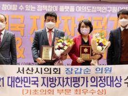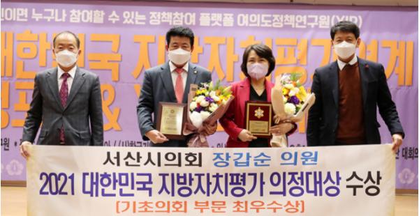서산시의회 장갑순 의원(대산·지곡·팔봉)이 여의도정책연구원이 주관하는 ‘2021 대한민국 지방자치평가 의정대상’에서 가장 우수한 기초의원으로 선정됐다.