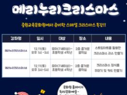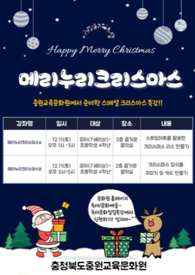 [20211211223205-31329]충청북도중원교육문화원은 연말을 맞이하여 어린이들에게 도서관에서의 즐거운 추억을 만들어 주기 위한 어린이 맞춤형 ‘메리누리크리스마스’ 특강을 운영하였다.