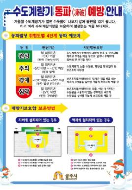 아울러 수도시설 상습 동파지역과 장기간 미사용 수용가 등 취약지역을 중점적으로 관리하고, 계량기 검침 시 수도계량기에 보온 조치 여부를 확인해 안내할 예정이다.