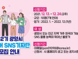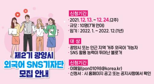 광양시는 시정 소식과 지역 매력을 국내외에 홍보하기 위해 ‘2022 제2기 외국어 SNS기자단’을 공개 모집한다.