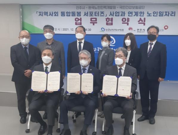 전주시와 한국노인인력개발원, 국민건강보험공단은 13일 고양시 한국노인인력개발원 대교육장에서 김승수 전주시장과 변재관 전주시 통합돌봄 총괄자문관, 김미곤 한국노인인력개발원장, 김용익 국민건강보험공단 이사장 등 관계자가 참석한 가운데 ‘지역사회 통합돌봄 서포터즈 사업과 연계한 노인일자리 창출 업무협약’을 체결했다.