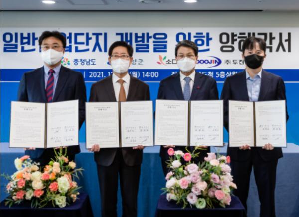 이날 오후 2시 충남도청 상황실에서 열린 협약식에는 양승조 충남도지사, 김돈곤 청양군수, 육우람 소다미㈜ 대표, 이규진 ㈜두진건설 대표 등이 참석해 청양지역 최초 민간 산업단지의 성공적 추진을 약속했다.