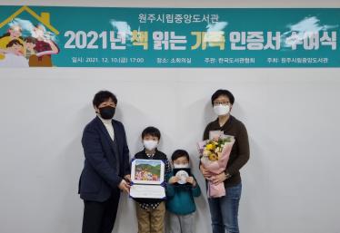 원주시립중앙도서관은 지난 10일 가족 단위 독서 생활을 모범적으로 실천한 두 가족을 선정해 ‘2021년 책 읽는 가족’ 인증서와 현판을 전달했다.