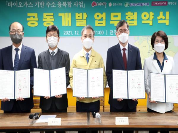 전주시와 전주시의회, 한국수력원자력(주), ㈜태영건설, 전북도시가스(주)는 14일 전주시장실에서 바이오가스 기반 수소 융복합사업 공동개발 업무협약을 체결했다.