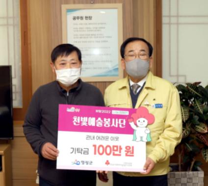 영광군 천빛예술봉사단은 지난 13일, 노래와 사랑으로 세상을 행복하게 만들기에 앞장서는 회원들이 성금을 모아 영광군에 희망2022 나눔캠페인 성금 100만 원을 기탁하였다.
