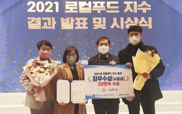나주시는 14일 농림축산식품부, 한국농수산식품유통공사(aT)에서 주관하고 (사)소비자 시민모임이 시행하는 ‘2021년 로컬푸드 지수 결과 발표 및 우수 지자체 시상식’에서 2년 연속 A등급을 받아 최우수상을 수상했다고 밝혔다.