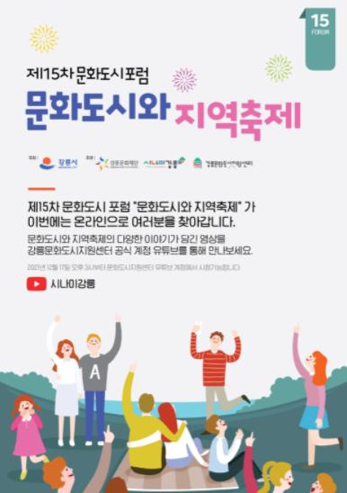 강릉시에서 주최하고 (재)강릉문화재단 산하 강릉시문화도시지원센터에서 주관하는‘제15차 강릉 문화도시 포럼’ '문화도시와 지역축제'를 온라인을 통해서 개최한다.