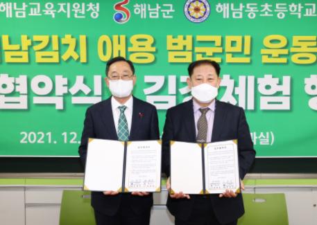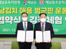 해남군과 해남교육지원청은 14일 해남동초등학교에서 업무협약을 맺고, 관내 유치원과 초·중·고 급식용 김치의 해남김치 사용과 유년층 및 청소년을 대상으로 하는 김치 식습관 개선교육을 위해 적극 협력해 나가기로 했다.