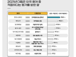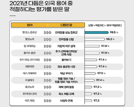 올해 다듬은 말의 적절성을 묻는 질문에는 98% 이상이 ‘펫 로스 증후군’을 대체한 ‘반려동물 상실 증후군’과 ‘펫코노미’를 대체한 ‘반려동물 산업’을 가장 적절하게 다듬은 말이라고 꼽았다. 이 외에도 응답자의 97% 이상이 ‘잡 크래프팅(자신의 업무 가운데 조절할 수 있는 부분을 자발적으로 의미 있게 변화시키거나 발전시킴으로써 업무에 대한 만족감을 높이는 일)’을 다듬은 ‘자발적 직무 설계’와, ‘플러스 옵션(기본 선택 사항 외에 일부 사항을 수요자가 추가하는 방식)’을 다듬은 ‘추가 선택제, 추가 선택권, 추가 선택 사항’을 긍정적으로 평가했다.