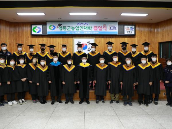 충북 영동군은 지난 14일 오후 졸업생 58명이 참석한 가운데 2021년도 영동군농업인대학 졸업식을 가졌다고 밝혔다.