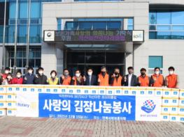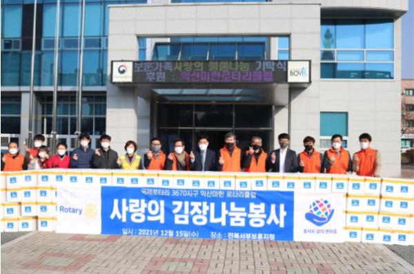 익산마한로타리클럽 회원과 전북서부보훈지청 직원들은 자원봉사자들이 정성스럽게 담근 1,500여 포기의 김장김치를 6개 시·군의 고령 및 저소득 취약계층 보훈가족 50가구에게 전달하여 나눔을 실천했다.