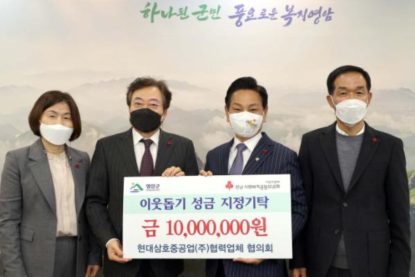 현대삼호중공업(주)협력업체 협의회는 매년 정기적으로 영암군의 불우 이웃을 위해 성금을 기부하고 있으며, 성금은 전남사회복지공동모금회를 통해 지정 기탁하여 지역 내 도움이 필요한 취약계층으로 지원할 예정이다.