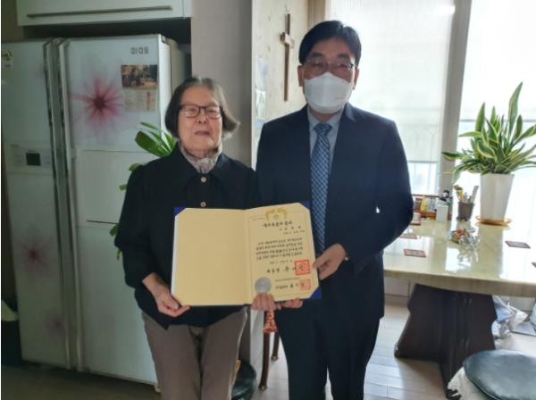 전북서부보훈지청은 14일 신규 국가유공자(전몰군경) 및 참전유공자로 등록되신 故강춘욱님의 동생인 강광자님(군산 거주)을 방문하여 대통령명의 증서를 전수하였다.