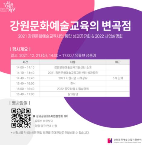 '2021 강원문화예술교육지원사업 통합 성과공유회'는 오는 12월 21일 14시부터 실시간으로 진행되며, 유튜브 채널을 통해 누구나 시청할 수 있다. 12월 20일까지 네이버폼 신청서를 작성하면 당일 휴대전화로 성과공유회 링크를 안내받을 수 있다.