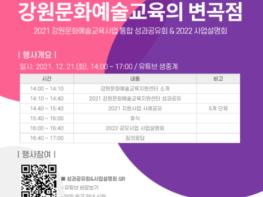 강원문화재단이 오는 12월 21일 '2021 강원문화예술교육지원사업 통합 성과공유회'를 온라인 생중계로 진행한다. 통합 성과공유회는 1부 강원문화예술교육지원센터 성과공유회, 2부 2022년 공모 사업설명회로 운영된다.