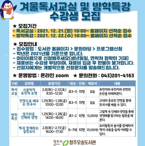 청주오송도서관은 겨울방학을 맞은 아이들에게 다양한 체험과 학습의 기회를 제공하기 위해 독서교실과 방학특별프로그램 모집을 각각 21일, 22일 10시부터 도서관 홈페이지를 통해 선착순 접수를 받는다.