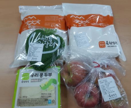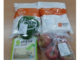2만4천원 상당의‘농산물꾸러미’구성 품목은 올해 수확한 햅쌀과 사과, 깻잎, 두부(무농약콩), 밀가루(무농약밀)로 옥천군에서 생산되는 지역 농산물로 구성되었다.