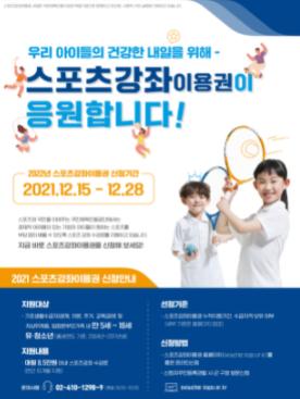 스포츠강좌 이용권 사업 지원대상자로 선정된 유·청소년이 태권도, 합기도, 검도, 헬스 등 스포츠 시설을 이용할 경우 1인 1강좌 월 8만5천원 내에서 강좌비를 지원받는데 시는 2022년에 4,864명을 지원할 방침이다.