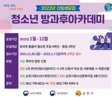 순천시는 오는 20일부터 2022년도 청소년방과후아카데미 신입생을 모집한다.