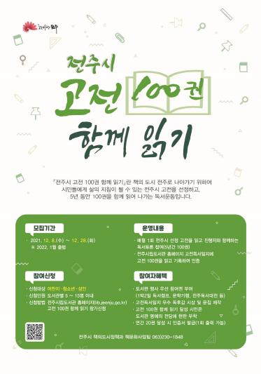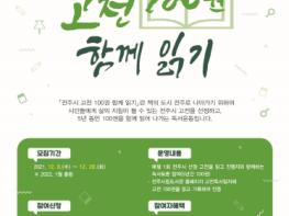 ‘전주시 고전 100권 함께 읽기’는 시민 누구에게나 삶의 지침이 될 수 있는 고전을 선정해 5년 동안 100권을 함께 읽어 나가는 독서 운동으로, 지난 7월 성인 1기를 시작으로, 매년 1월과 7월에 새로운 기수가 출범한다.