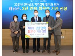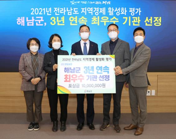 해남군이 전라남도에서 실시한 2021년 지역경제 활성화 평가결과 최우수상의 영예와 포상금 1,000만원을 받는다.