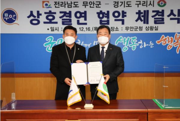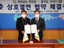 무안군은 16일 경기도 구리시와 양도시의 발전과 번영을 도모하기 위한 온라인 비대면 방식의 상호협력 자매결연 체결식을 개최했다고 밝혔다.