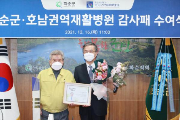 앞서 구충곤 화순군수도 매년 의료 취약계층을 위한 의료봉사와 화순 8경 홍보 등 화순군의 발전에 이바지한 문경래 호남권역재활병원장에게 감사패를 전달했다.