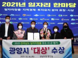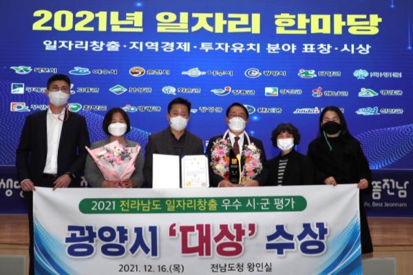 광양시는 12월 16일 전남도청 왕인실에서 열린 ‘전라남도 일자리·투자유치 한마당’ 행사에서 2021 전남 일자리창출 우수시군 평가 ‘대상’을 수상했다.