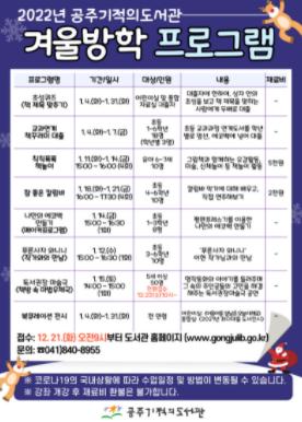공주시는 진로설계, 체험 프로그램 등 연령대별로 참여할 수 있는 다양한 도서관 겨울방학 프로그램을 운영한다고 17일 밝혔다.