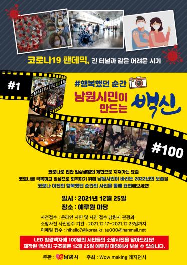 「행복했던 순간, 남원시민이 만드는 백신(100 scene)」에 참여를 희망하는 남원시민은 12월 23일까지 담당자 이메일로 ‘코로나 이전 행복했던 순간’의 사진을 보내면 된다.