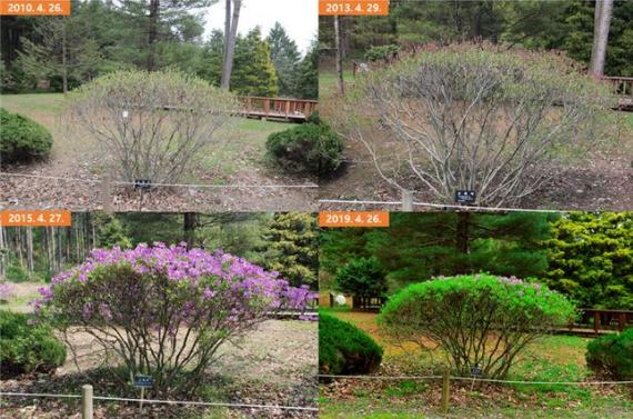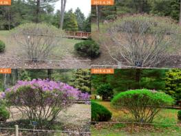 한편, 10년간의 식물계절 변화는 계절적 평균 온도와 가장 밀접하게 연관되며, 개엽의 경우 봄철 평균 기온이 1℃ 올라가면 3.6일 빨라지고, 단풍은 가을철 평균 기온이 1℃ 올라가면 1.5일 늦어지는 것으로 분석되었다.
