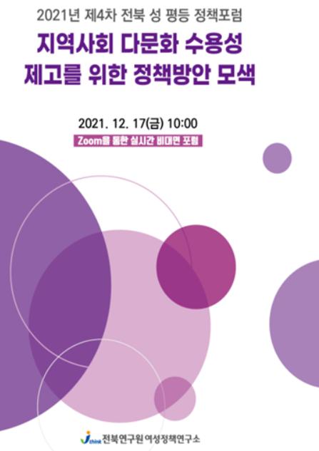 전북연구원 여성정책연구소는 17일 오전 10시‘지역사회 다문화 수용성 제고를 위한 정책방안 모색’을 주제로 제4차 전북 성 평등 정책포럼을 온라인 비대면 (ZOOM) 방식으로 개최하였다.