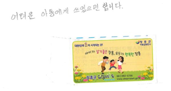 이 봉투에는 ‘어려운 아동에게 쓰였으면 합니다’라는 메모가 적혀 있었으며, 장흥군드림스타트 스티커가 붙여져 있었다고 한다.