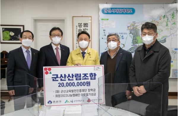 17일 군산시는 군산산림조합(조합장 고석빈)이 이웃돕기 성금 1,000만원과 장학금 1,000만원을 기탁했다고 밝혔다. 군산산림조합은 지난 1962년 설립 이래 지역의 맞춤형 산림 육성과 늘 푸른 숲 도시 조성을 위해 지속적인 노력을 기울이고 있다.