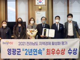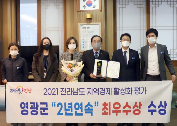 영광군은 지난 29일 전라남도가 주관한“2021년 지역경제 활성화 평가”에서 2년 연속 최우수상을 수상하며, 기관표창과 함께 일천만 원의 포상금을 받았다고 밝혔다.