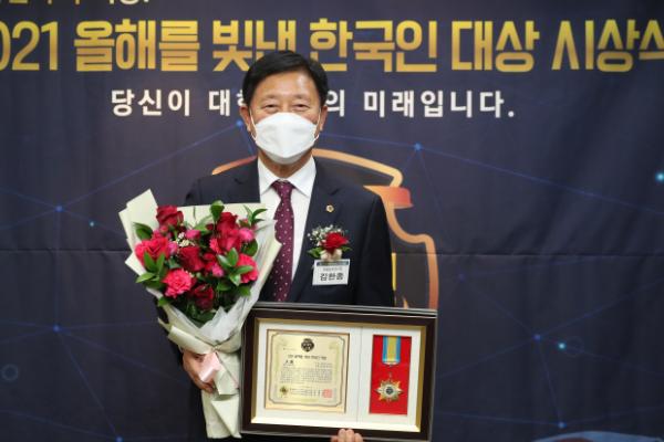 전라남도의회 김한종 의장이 17일 한국프레스센터에서 열린 2021 올해를 빛낸 한국인대상 시상식에서 ‘의정혁신 부문 대상’을 수상했다.