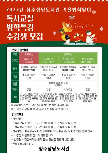 청주상당도서관은 2022년 겨울방학특강에 참여할 수강생을 12월 22일 10시부터 도서관 홈페이지를 통해 선착순으로 모집한다. 2022년 겨울방학특강은 내년 1월 18일부터 운영될 계획이다.