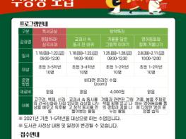 이번 겨울방학특강은 초등 1-4학년을 대상으로 하며, ‘교과서 속 동시 한 바퀴’, ‘겨울을 담은 그림책 이야기’, ‘영어동화와 함께 겨울나기’ 등 3개 강좌의 수강생을 모집 받는다. 모든 강좌의 수업료는 무료이며, 일부 강좌의 경우 재료비를 필요로 한다.