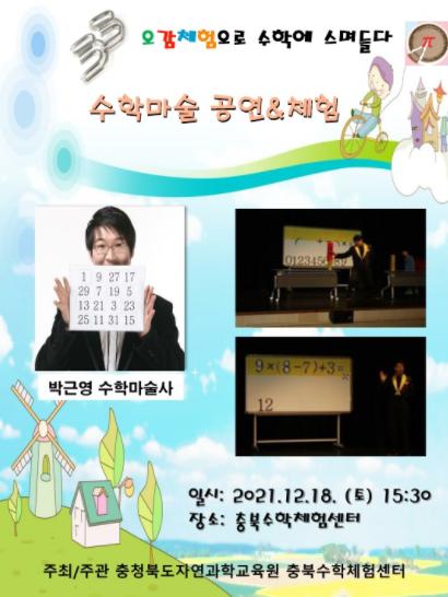특히, 18일 오후에는 1부 문화예술공연(50명 대상), 2부 수학마술공연 및 체험 프로그램(80명, 20명씩 분산 체험운영)을 도내 유?초?중?고 학생들의 가족 및 교원 대상으로 운영한다.