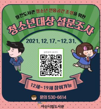 아산시가 오는 31일까지 관내 청소년을 대상으로 월천도서관 청소년 전용공간 조성을 위한 설문조사를 실시한다.