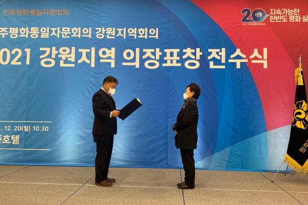 민주평화통일자문회의 태백시협의회 최정숙 자문위원과 태백시 총무과 용선희 과장이 20일 강원지역 의장표창 전수식에서 2021년도 평화번영의 한반도 기반조성 유공으로 대통령(의장) 표창을 수상하는 영예를 안았다.