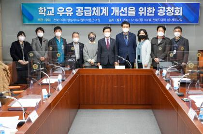 전라북도의회 행정자치위원회 박용근 의원(장수)이 16일 전북도의회 세미나실에서 ‘학교 우유 공급체계 개선을 위한 공청회’를 개최했다. 이번 공청회는 학교 우유 급식의 현 실태와 개선방안을 논의하기 위한 것으로, 도 축산과 축산경영팀 이희선 팀장, 교육청 인성건강과 도혜숙 사무관, 전국공무원노동조합 전북교육청 지부 김영근 사무국장, 전국교직원노동조합 전북지부 전보라 조직국장, 정일여중 백영숙 영양교사, 원광대학교 법학전문대학원 김은진 교수 등이 참석했다.