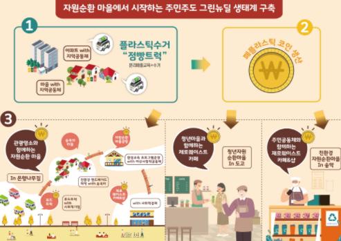 아산시는 사회적경제 조직들이 함께 힘을 모아 폐플라스틱 사용량을 감축하는 순환 경제를 구축하는 사업계획으로 공모사업에 최종 선정됐다. 사업계획에 따르면 우선 마을공동체에서 50개 시민 수거 거점을 전기 트럭으로 순회하며 양질의 폐플라스틱을 수거한다. 수거된 폐플라스틱을 소재로 코인 화폐를 만들고 이를 수거 보상으로 나눠 준다. 코인 화폐는 3개의 자원순환 마을에서 진짜 화폐처럼 사용한다.