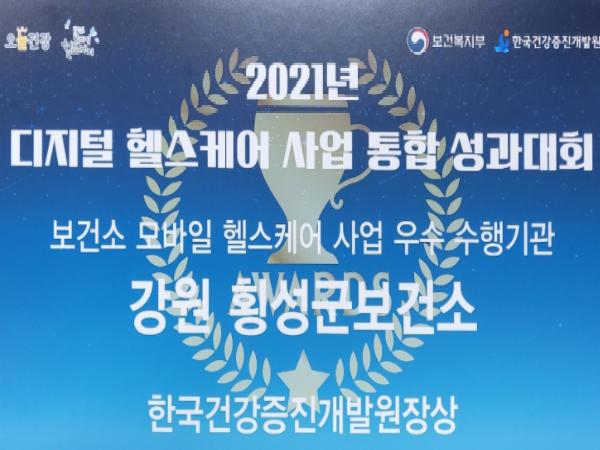 횡성군 모바일헬스케어사업이 2021년 한국건강증진개발원 디지털 헬스케어부문 평가에서 우수기관으로 선정되어 한국건강증진개발원장상을 수상하였다.