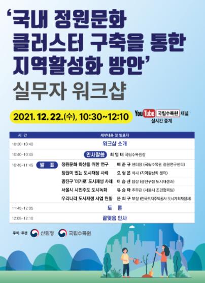 산림청 국립수목원은 2021. 12. 22. 오전 「국내 정원문화 클러스터 구축을 위한 실무자 워크숍」을 개최한다.