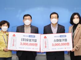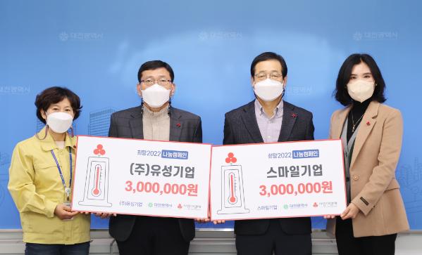 대전시는 21일 오전 대전시 자동차 등록번호판 발급 및 교부 대행업체인 스마일기업(대표 김영란)과 ㈜유성기업(대표 임성빈)이 어려운 이웃들을 위해 사용해 달라며 6백만 원을 사랑의 성금으로 사회복지공동모금회에 기탁했다고 밝혔다.
