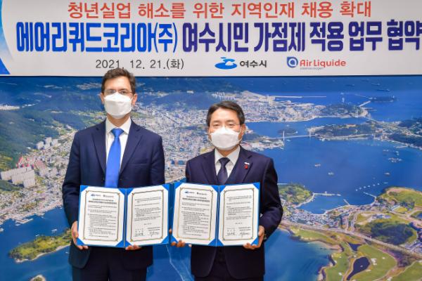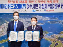 21일 여수시에 따르면 이날 오후 시청 시장실에서 ‘에어리퀴드코리아(주) 인력채용 여수시민가점제 적용 협약식’이 열렸다.