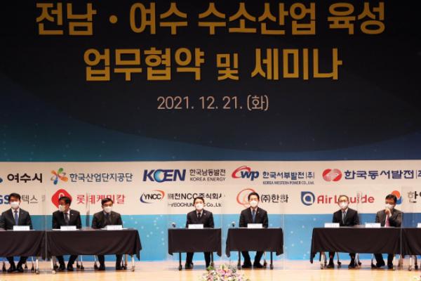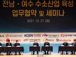 전남도는 21일 여수시청에서 김영록 전남도지사, 권오봉 여수시장을 비롯해 GS칼텍스, 롯데케미칼, 한화/글로벌, 여천NCC, 에어리퀴드코리아, 한양 등 여수산단 주요 기업과 발전공기업 등 13개 기관이 참석한 가운데 ‘수소산업 육성 업무협약’을 했다.